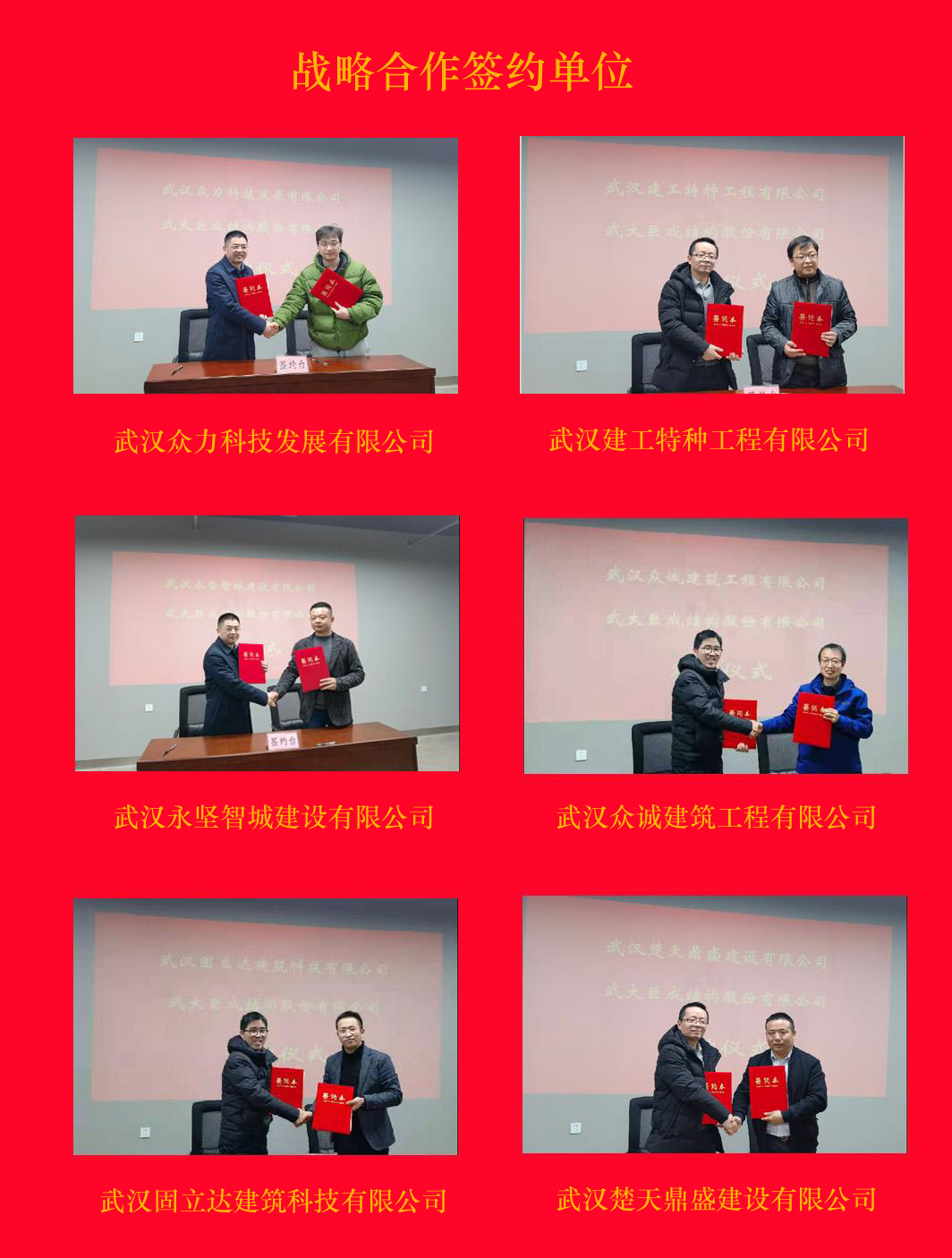 2020年12月24日,公司在巨成大廈四樓再次舉行湖北加固改造企業(yè)戰(zhàn)略合作協(xié)議簽訂儀式,本次簽約單位有武漢眾力科技發(fā)展有限公司、武漢建工特種工程有限公司、武漢眾誠建筑工程有限公司、武漢永堅(jiān)智城建設(shè)有限公司、武漢楚天鼎盛建設(shè)有限公司、武漢固立達(dá)建筑科技有限公司。公司總經(jīng)理萬雄衛(wèi)、副總經(jīng)理廖杰洪、副總經(jīng)理張暢、營銷公司相關(guān)負(fù)責(zé)人參加了本次簽約儀式。