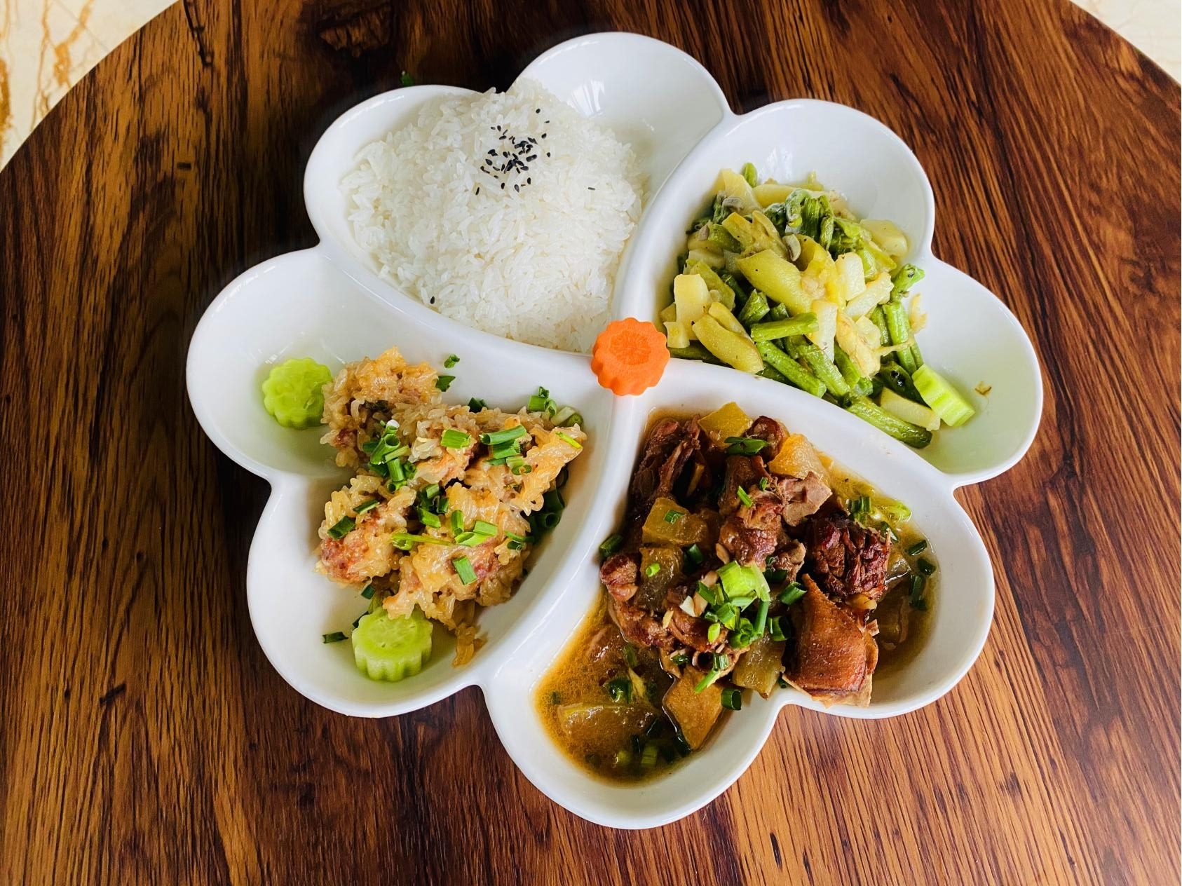 為了確保幼兒的營養(yǎng)均衡,幼兒園實(shí)行三餐兩點(diǎn),采用帶量食譜。每日保證幼兒能吃到品類豐富的水果、干果、蔬菜、魚肉、谷類等食物。