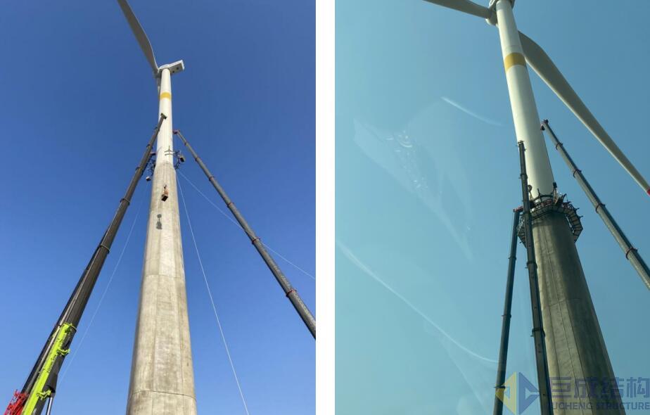 2021年初的寒潮相比往年更猛烈,巨成結(jié)構(gòu)位于山東鄄城的施工場地達(dá)到零下18℃,滴水成冰,而疫情又在河北復(fù)燃。鄄城項(xiàng)目風(fēng)機(jī)塔筒采用預(yù)應(yīng)力混凝土與鋼筒結(jié)合的組合結(jié)構(gòu)形式,總高度140m,該創(chuàng)新體系在國內(nèi)是首次使用,因此它的安全使用對于業(yè)主和行業(yè)的發(fā)展都有重要意義。巨成的任務(wù)是在春節(jié)前完成兩個(gè)風(fēng)機(jī)塔筒加固。