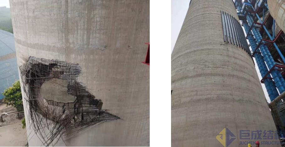 2021年8月23日凌晨,巨成公司接到老河口水泥廠的緊急求援電話,公司立即由總工周劍波教授帶隊(duì)赴現(xiàn)場踏勘。生料庫直徑24m,高度60m,在25m附近出現(xiàn)一個(gè)高寬10余米的破損洞口。