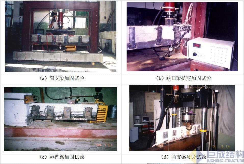 二十年來,巨成結(jié)構(gòu)科研人員對粘接型鋼加大截面加固法開展了相關(guān)理論分析、力學(xué)性能試驗(yàn)研究和數(shù)值分析,包括粘接型鋼加大截面加固簡支梁抗彎試驗(yàn)研究、粘接型鋼加大截面加固缺口梁端部抗剪試驗(yàn)研究、粘接型鋼加大截面加固懸挑梁抗彎試驗(yàn)研究、粘接型鋼加大截面加固簡支梁重載疲勞試驗(yàn)研究、粘接型鋼加固混凝土板試驗(yàn)研究等(如圖4),取得了豐富的研究成果,具有理論、試驗(yàn)研究分析和大量實(shí)際應(yīng)用基礎(chǔ)。